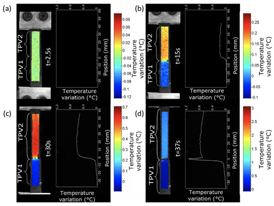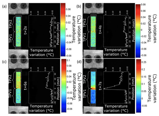The analysis of the average temperature variation during the test in each of the two materials far from the interface, i.e., without thermal gradients induced by the stress and strain concentrations of the interface, enabled us to show that the elasticity of the TPVs constituting the specimen is both entropic and isentropic. A competition between the two types of elastic couplings occurs at the low strains. The isentropic coupling is first preponderant, then the entropic coupling takes over. Nevertheless, this analysis does not allow the study of the mechanical behaviour and the effects of the interface in the different materials to be further investigated. This is the reason Figure 17 and Figure 18 show the temperature variation fields and the temperature variation profiles along the specimens at and , respectively. Please note that these profiles were determined by averaging the temperature variations across the width. The temperature profiles along the specimen length show a different thermal response for the two TPV as detailed previously. For the smallest and moderate strains (t = 2, 4, 6 and for specimen at , and t = 2.5, 15, 30 and for specimens at ), the thermal response is different from one TPV to another, but it is homogeneous in each TPV. The interfaces do not have a specific thermal signature. Nevertheless, for the highest strains, i.e., close to those at failure, the thermal field exhibits a strong singularity in the interface zone. Indeed, a strong increase in temperature occurs in this zone and can be considered to be a precursor of the interface failure. Such temperature increase is observed in many materials when damage takes place [62]. Please note that the increase in temperature is mainly observed in TPV2. The zone where the temperature is observed is larger (approximately ) in TPV2 in specimen at than in specimen at (approximately ). It should be noted that the temperature rise is and for the overmoulded samples at and , respectively. The fact that an increase in temperature is mainly observed in TPV2 before failure can be interpreted as the effect of an increase of intrinsic dissipation due to internal friction accompanying PP chain disentanglements. Nevertheless, additional experiments must be carried out to further investigate the physical origin of this increase in temperature rise.
