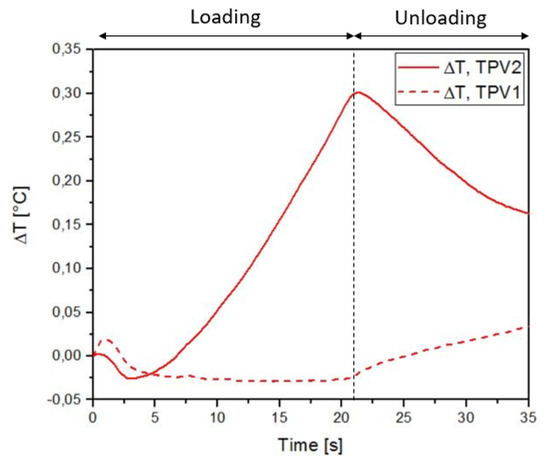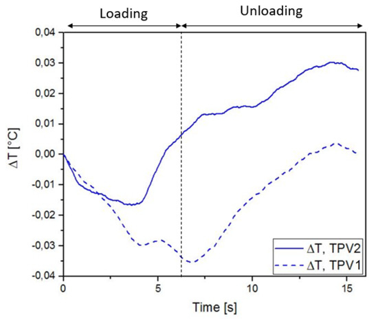 Figure 19 and Figure 20 show the thermal response of the overmoulded specimens at and respectively for the mechanical cycle. The thermoelastic inversion for TPV2 is observed for both overmoulding temperatures during the loading phase. For the overmoulded specimens, the TPVs temperature is increasing during the unloading phase reflecting intrinsic dissipations due to viscosity and/or damage. For the overmoulded specimens, the temperature of TPV1 is increasing. Temperature is decreasing for TPV2, meaning that the heat produced due to viscosity decreases.