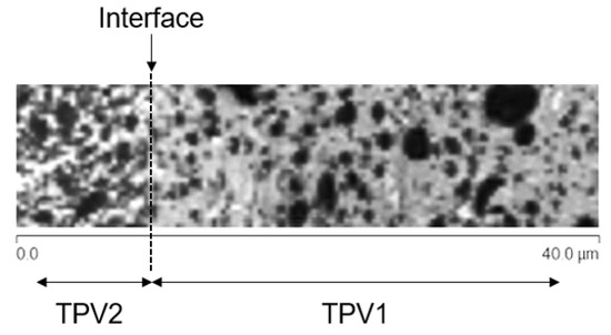 The elastic properties of the two TPV are very different. This is partly due to their compositions, in particular, their respective proportions of PP and EPDM. Figure 14a,b present an AFM phase image of TPV1 and TPV2, respectively. TPV1 and TPV2 were previously cryo-microtomed from the overmoulded specimens. The phase images can be used to visualize the distribution of the EPDM phase (dark areas) in the PP matrix (bright areas) [61]. TPV1 has larger elastomer nodules and a higher proportion of PP than TPV2. This implies different mechanical responses as shown in Figure 10 and Figure 13. These observations are also in good agreement with the hardness ratio of both TPV presented in Table 1.