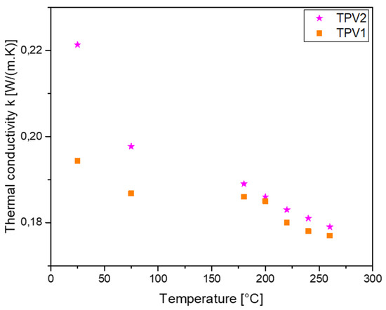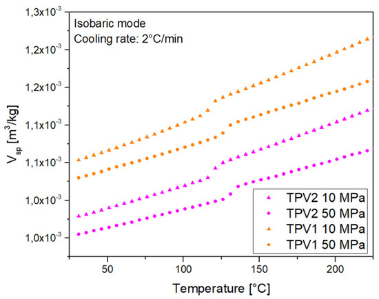 The specific heat () of both TPV has been determined by differential scanning calorimetry (Q200, TA Instruments). The measurements were made at a heating rate of between and . The specific volume , in m/kg, was measured with a home-made PVT device [24] for and at a cooling rate of . Thermal conductivity k in W/(m.K) was measured for the temperature ranging between and thanks to a home-made guarded hot plate [25].