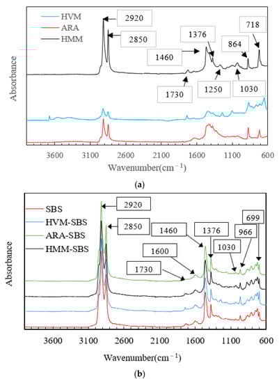 It can be seen from Figure 2a that the FTIR characteristic peaks of the three polymer additives were not the same. For HMM, the absorption peaks mainly appeared at 2920 cm−1, 2850 cm−1, 1730 cm−1, 1460 cm−1, 1376 cm−1, 1250 cm−1, 1030 cm−1, 864 cm−1, and 718 cm−1 etc. The peaks at 2920 cm−1 and 2850 cm−1 were due to the antisymmetric stretching vibration and symmetric stretching vibration of methylene (CH2), separately. The peak at 1460 cm−1 was caused by the deformation vibration of the C–H bond. The peak at 1376 cm−1 was formed by a specific vibration of methyl (CH3). The peak at 864 cm−1 was caused by C–C stretch. The peaks at 1030 cm−1 and 718 cm−1 were due to the S–O stretch and C–S bend, respectively [32,33]. The peaks at 1730 cm−1 and 1250 cm−1 were the characteristic peaks of esters, which may have been caused by the plasticizer in HMM [34]. HVM showed a similar FTIR characteristic peak to HMM. However, a very slight observable change in peak position was clear in the FTIR spectra of HMM and HVM, indicating that the plasticizer or crosslinker used in HVM and HMM was different. For the FTIR spectra of ARA, there were no characteristic peaks of esters.