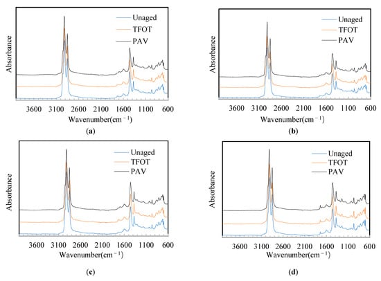 TFOT and PAV were adopted to age different asphalt binders. The FTIR pictures of asphalt binders after aging are shown in Figure 3.