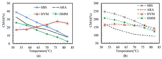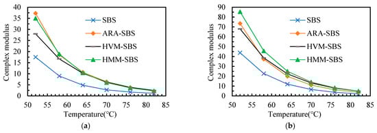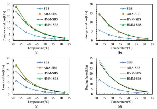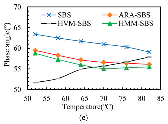 According to Figure 4, some points can be observed. (1) When polymer additives were added to the SBS asphalt binder, the complex modulus, storage modulus, and loss modulus were substantially increased, and the improvement caused by ARA and HMM was comparable and higher than that of HVM. Moreover, the rutting factor also increased obviously, indicating that polymer additives enhance the rutting resistance of the SBS asphalt binder. (2) The phase angle decreased after the polymer additives were added. A lower phase angle means that there were more elastic components than viscous components in the material. Thus, Figure 4e shows that the addition of polymer additives to the SBS asphalt binder could improve its elasticity, which enhanced the shear-deformation resistance of the SBS asphalt binder. Additionally, the phase angle of the HVM-SBS increased with the temperature, while the other three asphalt binders showed an opposite rule. (3) By comparing Figure 4b,c, it can be observed that the storage modulus of the three polymer asphalt binders was almost the same, while the loss modulus of HVM-SBS was lower than that of HMM-SBS and ARA-SBS. This phenomenon shows that the three polymers had a similar ability to improve the elastic part of SBS asphalt. In contrast, HMM and ARA had a better ability to improve the viscous part of SBS asphalt than HVM. The phase angle refleceds the proportional relationship between the viscous and elastic parts of the material. The different improvements on the elastic and viscous parts of SBS asphalt by the three polymers caused the different phase angles of the three polymer-modified asphalts.
