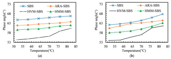 According to Figure 5, several points can be observed. (1) Comparing the phase angle before and after aging, it can be observed that the phase angle of the four kinds of asphalt binders became higher after aging, indicating that the aging process increases the proportion of viscous components in the asphalt binders. Generally speaking, the higher the molecular weight of the polymer, the higher the viscosity. The aging process made the small molecules in the asphalt change to large molecules, causing the proportion of viscous components in the asphalt binder to rise and the phase angle to become higher. (2) The phase angle of the SBS asphalt binder was the greatest at both the short-term aging state and long-term aging state, followed by ARA-SBS, HMM-SBS, and HVM-SBS. This indicates that the polymer additives help to improve the elasticity of the SBS asphalt binder. Aging increased the viscosity of asphalt. Thus, the modification on the elasticity caused by polymer additives decreased the aging sensitivity of the SBS asphalt binder.