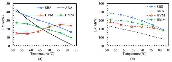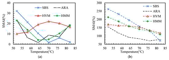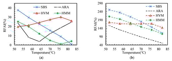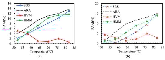 In this paper, the PAAI, CMAI, SMAI, LMAI, and RFAI were calculated to reflect the aging degree of asphalt binders. A higher aging indicator implies a greater aging degree of the asphalt binder. From Figure 7, Figure 8, Figure 9, Figure 10 and Figure 11, some general commonalities can be seen. (1) The result was not the same when the aging degree was evaluated with different aging indicators. For example, the PAAI of ARA-SBS was higher than that of SBS, indicating that ARA-SBS experienced more severe aging. However, the CMAI of ARA-SBS was lower than that of SBS, implying an opposite conclusion. (2) The value of the aging indicators increased significantly when the aging pattern was changed from TFOT to PAV. This phenomenon follows the result of CAI. (3) In general, all the aging indicators, except PAAI of SBS, were higher than that of the other three polymer binders, indicating that polymer additives modify the aging resistance of SBS. However, it is hard to judge which polymer additive modified the aging resistance most. When the improvement on the aging resistance was evaluated with different aging indicators, the evaluation results were not the same. For example, the PAAI of ARA-SBS was higher than that of HMM-SBS, implying that HMM is more beneficial to improve the aging resistance of SBS. However, when this situation was evaluated with SMAI, an opposite conclusion could be drawn. (4) In most cases, the aging indicators of HVM-SBS increased with the temperature, while that of ARA-SBS and HMM-SBS showed the opposite rule.