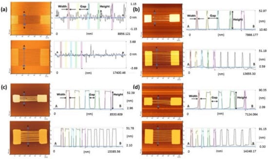 (a) AFM profile image of 5 wires and 10 wires before etching. AFM profile image of 5-wire and 10-wire SiNW devices after etching with addition of (b) 10 vol.%, (c) 20 vol.%, (d) 30 vol.% IPA.