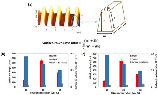 Two types of SiO2 patterns, consisting of 5- and 10-wire arrays, were fabricated via the AFM-LAO technique, as depicted in Figure 1a. The patterns were etched using TMAH 25 wt.% with different additions of IPA concentrations: 10, 20, and 30 vol.% at 65 °C for 30 s. The fabricated SiNW devices were characterized under AFM contact mode topography and the results shown in Figure 1b–d were obtained with respect to the etching parameters. All SiNWs produced have a trapezoidal shape [8]. The width and height of the SiNWs were measured directly with the AFM software. By using the widths and heights of the produced SiNWs after etching, the surface-to-volume ratio for all SiNWs were calculated using the formula shown in Figure 2a. Figure 2b,c, display the results of the width, height, and surface-to-volume ratio of SiNWs etched with 10, 20, and 30 vol.% of IPA. The widths and heights of SiNWs etched with different IPA concentrations represent different values for both 5-wire and 10-wire devices. This is because a different concentration of IPA gives a different etching rate that influences the amount of silicon layer removal, which contributes to a different value of the surface-to volume ratio. In the etching solution, the Si surface was found to be ‘hydrogen-terminated’ and the surface became hydrophobic. The hydrocarbon chains from IPA molecules bound to the hydrogen-terminated Si surface by van der Waals forces. As the IPA concentration increased, the IPA and TMAH solutions became saturated, causing the disturbance of the hydrogen-bonding network between the IPA molecules and the hydrogen-terminated silicon surface with more IPA molecules, which caused an increase in the etching rate [18]. A fast etching rate removes more uncovered silicon layers and produces higher or thicker SiNWs. Still, surface roughness (Ra) of SiNWs was also affected when different concentrations of IPA were used during the etching process. Figure 3 indicates the roughness of SiNW devices that were etched at concentrations of 10, 20, and 30 vol.% of IPA. The results show that the surface roughness decreases as the IPA concentration increases. This shows that the addition of IPA concentration improves the surface roughness of the SiNWs.