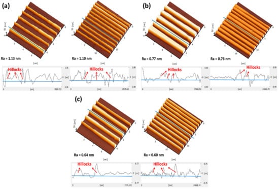 Surface roughness (Ra) of 5-wire and 10-wire devices after etching with TMAH 25 wt.% and IPA, (a) 10 vol.%, (b) 20 vol.%, (c) 30 vol.%.