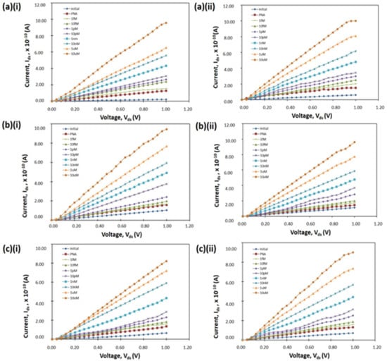 Current–voltage curves of SiNW devices etched using IPA at various concentration; (a) 10 vol.%, (b) 20 vol.%, (c) 30 vol.% for (i) 5-wires and (ii) 10-wires.
