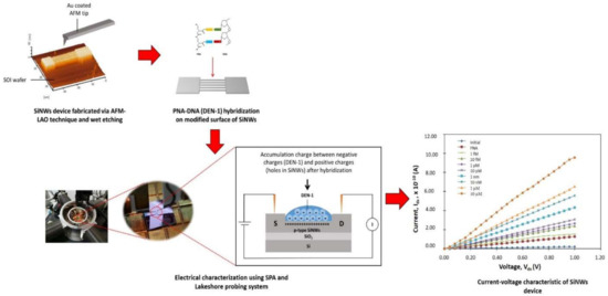 Electrical characterization of the SiNW devices using SPA and the Lakeshore probing system. The accumulation of negative charges from DEN-1 and positive charges of SiNWs occurred after hybridization and resulted in changes in resistance that caused the current to increase.