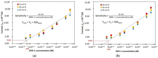 Moreover, the performance of the biosensor device can also be evaluated by calculating the limit of detection (LOD). The LOD of the biosensor device is the smallest concentration detectable by the particular device. The procedure for calculating LOD is to plot a curve of the calculated relative change in the current at the various concentrations of DEN-1, ranging from 1 fM to 10 µM. Then YLOD is calculated using YLOD = Y(baseline, immobilization) + 3σ [17,19]. The Y(baseline, immobilization) is the response of the blank signal and is assumed to be 0, while is the standard deviation of the regression calibration curve [20,21,22]. The calculated YLOD in the calibration curve extends to XLOD, which corresponds to the lowest detectable DEN-1 concentration. Table 1 summarizes the LODs for each device. The sensitivity and LOD for each device has a different value due to their physical factors, the number of wires, the dimensions of the wires, and the surface roughness.