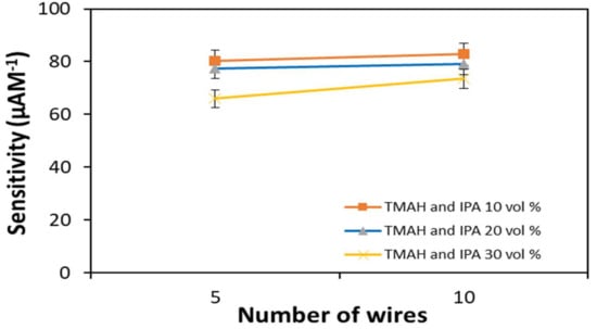 The number of wires is believed to be one of the parameters that affects the sensitivity of biosensors. A previous study reported that the number of bridging nanowires fabricated in a device is an important factor in determining sensitivity [22]. In this study, for a 5-wire device, an initial source–drain current of I0(5w) was experienced; introducing the DEN-1 analyte resulted in the hybridization of DEN-1 onto the SiNW surface, to produce a change in the device current (I − I0)5w. The sensitivity was calculated by (I − I0)5w/DEN-1 concentration. Similar to the 10-wire device with an initial source-drain current of I0(10w), the sensitivity of the 10-wire device was calculated as (I − I0)10w/DEN-1 concentration. Figure 7 indicates the plot of sensitivity against the number of wires consisting in the SiNW devices. The results show higher sensitivity if the device has more wires, irrespective of etching parameters. The increase in sensitivity of the devices etched with 10% by volume IPA and 20% by volume IPA is small compared to the device etched with 30% by volume IPA.