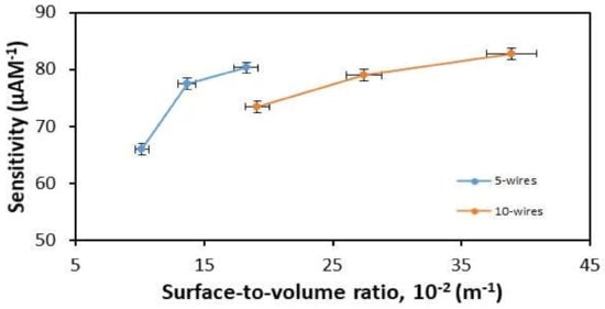 Sensitivity vs. surface-to-volume for 5-wire and 10-wire devices.