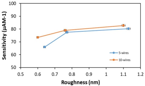 The surfaces roughness of wires after etching varied for each case because of the usage of different IPA concentrations during the wet chemical etching process. Figure 9 indicates the relation between sensitivity and surface roughness of SiNWs for 5-wire and 10-wire devices. It shows the sensitivity for both devices increasing as the roughness of SiNWs increases for 5-wire and 10-wire devices. This shows that physical factors, such as surface roughness, could affect the sensitivity of a biosensor device. Additionally, a rough surface contributes to a large surface-to-volume ratio, which could improve device performance [23].