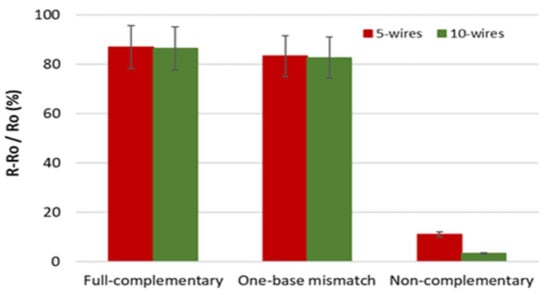 Hybridization specificity (devices etched with TMAH and IPA 10 vol.%) presented by changes in resistance to full-complementary, one-base mismatch, and non-complementary sequences.