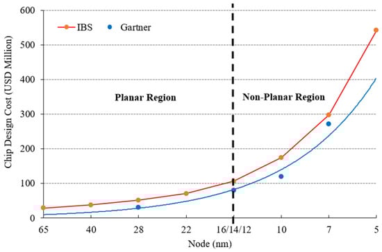 As FDSOI and FinFET continue to garner interest as innovations in silicon process technologies, not many studies have been performed on planar bulk MOSFET technology below 28 nm. According to the Center for Security and Emerging Technology (CSET), a think tank on national and international emerging technologies based in the United States, 3-D transistors such as multi-gate field-effect transistors (MuGFETs), FinFET, and GAAFETs are used primarily in chips for advanced artificial intelligence (AI) applications at technology nodes ≤16 nm for competitive performance. However, planar transistors are still very commonly used for chips at less advanced nodes (>20 nm) []. As depicted in Figure 1, chip design and manufacturing costs increase exponentially as technology nodes advance and when changing from transistors with a planar architecture to those with a non-planar architecture. In a rough comparison, Figure 1 shows that the chip design cost for a planar region is around USD 1.6 million per node, whereas for a non-planar region it is about USD 40 million per node (nm) []. It is not surprising that only 8.5% of global fabrication capacity is able to be used to fabricate advanced AI chips at ≤16 nm. In comparison, only a fraction of this 8.5% is currently used for this purpose []. Therefore, the 28-nm planar node still commands a significant market size in several applications such as artificial intelligence (AI), IoT/edge computing, radio frequency (RF), and wearables. Currently, the Taiwan Semiconductor Manufacturing Company (TSMC) and the United Microelectronics Corporation (UMC) offer a 22-nm planar bulk process, whereas GlobalFoundries is shipping a 22-nm FDSOI []. China’s semiconductor industry has predicted that it will have 28-nm chips as its main choice for a long time [], and technologies for the further downscaling of planar transistors are crucial for the long-term sustainability of semiconductor industries.