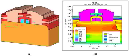 A 14-nm La2O3-based PMOS was fabricated virtually using advanced-process simulation tools from SILVACO TCAD software, version 2020, by SILVACO International, Santa Clara, CA, USA. The design of the PMOS with high-k/metal gate (HKMG) technology was modelled based on previous research [,] and simulated using the ATHENA process simulator []. La2O3 was identified to be the high-k oxide and tungsten as the metal gate for the fabricated PMOS [,]. The 3D schematic structure of the PMOS is shown in Figure 2a,b shows the PMOS load profile with the input parameters’ net doping concentrations. This process followed by halo implantation to adjust the Vth value to meet ITRS requirements [].