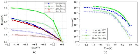 (a) Output characteristics of 14-nm-, 22-nm-, and 32-nm-gate-length planar bulk PMOSs; (b) transfer characteristics of 14-nm- and 22-nm-gate-length planar bulk PMOSs.