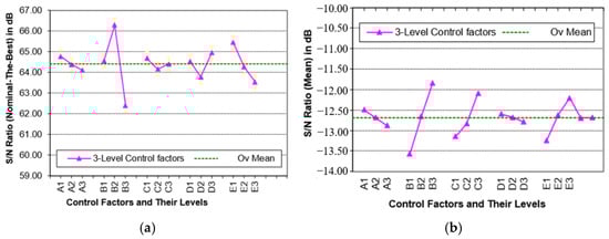graph for Vth are shown in Figure 5a,b, respectively. Factor B has a large effect on Vth and a small effect on the mean, according to the response graph. Factor C has a relatively small effect on Vth. Since the quality characteristics type was NTB, the response variable was based on the S/N