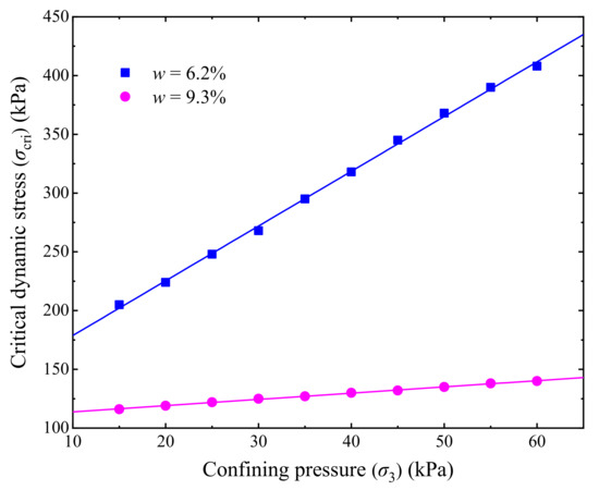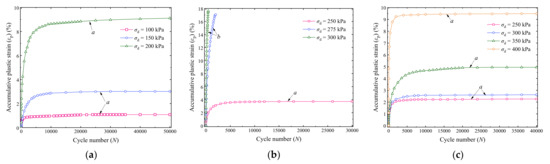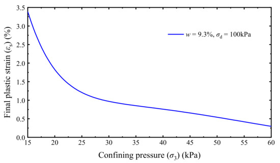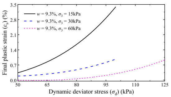 - The variation curves of εp with cyclic number (N) can be categorized into stable, failure, and critical patterns, and the grey relational analyses shown that the curve patterns and final accumulative plastic strain εs of stable specimens are closely related to the w, σ3, and σd. In addition, the analyzed grey relational grades were in a narrow range of 0.72 to 0.81, demonstrating that the w, σ3, and σd have similar importance degrees in determining the εp versus N curve patterns and the values of εp of the UGM.