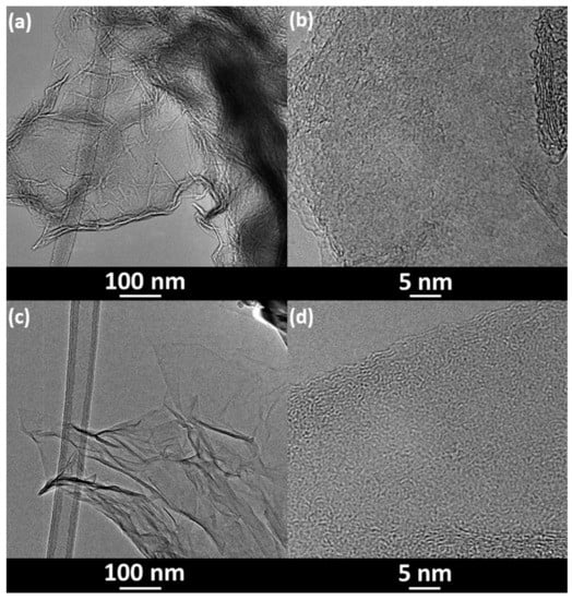 TEM images of (a,b) RGO-CH2O [23] and (c,d) RGO-CH2O-MWT.