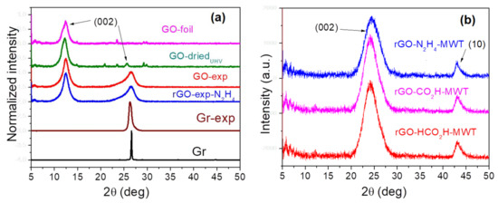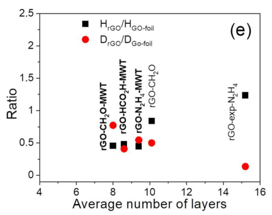 The GOs show the least number of flake layers, i.e., GO-driedUHV < GO-foil < GO-exp. The rGOs resulting from MWT exhibit the smallest number of flake layers for reducing conditions: CH2O-MWT < HCO2H-MWT < N2H4-MWT. The N2H4 reducing agent accompanied by MW and MWT procedures leads to increasing number of flake layers with no remarkable difference between MW and MWT treatments. In contrast, the CH2O reducing agent MWT procedure provides smaller number of flake layers in comparison to only CH2O reducing agent. Reduction using N2H4 of GO-exp provides larger number of flake layers in comparison to reduction of GO prepared from graphite.