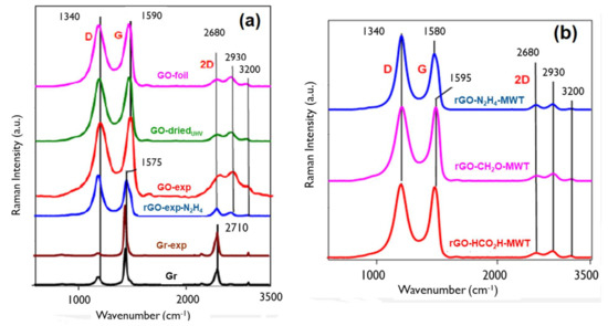 with C’ (514 nm)~0.55 nm−2. The average distance between defects, LD and density of defects, nD, can be also observed in I(D)/I(G) ratios since these values increase up to LD~4 nm (stage 2) and then decrease for LD > 4 nm (stage 1) [33] in agreement with a graphitization trajectory for carbon materials [29]. The FWHMs and intensities of D and G mode in GOs and rGOs indicate the distance between defects smaller than 3 nm [34]. Generally, the rGOs-MWT exhibit lower crystallinity than GOs (Figure S5—Supplementary Materials). As reported elsewhere for rGOs [29], increasing frequency of D mode and decreasing frequency of G mode accompanied by decreasing FWHM of D and G bands (Figure S3—Supplementary Materials) indicates decreasing C sp3 content and increasing La. The values of La for GO and rGO evaluated according to Equation (1) (Table 2) in the range of 1.3–1.55 nm are generally smaller for GOs.