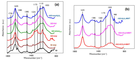 IR spectra of: (a) GOs, rGO and graphites, (b) rGOs obtained using different reducing agents and microwave treatment (MWT).