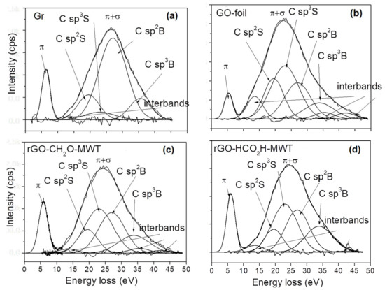 In REELS method investigates a primary electron reflected inelastically at the surface. The REELS spectrum of carbon materials reveals the chemical and structural properties of a near surface in values of intensity and energy of inelastically reflected electron losing its energy on valence electrons. For carbon the C atoms from the surface and bulk form π and π + σ bonds and exist in C sp2 and C sp3 hybridizations. The electron energy loss values were reported elsewhere for C sp2 containing graphite, C sp3containing diamond [38] and single layer graphene and graphene oxide samples [39,40]. The REELS spectra obtained from our experiments, were fitted using Gaussian functions, which reflect distribution of velocities leading to Doppler broadening. The energy loss values for bulk (B) and surface (S) C sp2 and C sp3 components, denoted as C sp2B, C sp2S, C sp3B, C sp3S, as reported previously for graphite, diamond [38] and graphite nanomaterials [22,23] were applied (Figure 5 and Figure S6—Supplementary Materials). Similarly, the FWHMs of the respective Gaussian components were applied, as shown previously for graphite and diamond [38].
