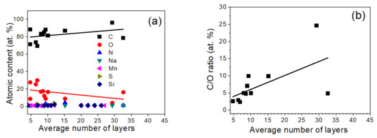 XPS determined: (a) surface atomic content (b) ratio of C to O atomic content dependent on the average number of layers in the investigated samples.