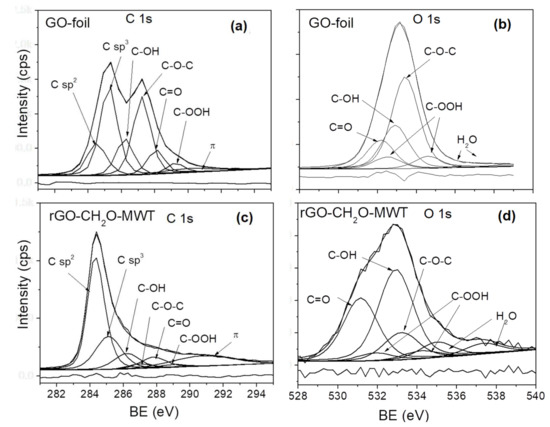 The C 1s and O 1s XPS spectra fitting using asymmetric Gaussian-Lorentzian function for the selected GOs and rGOs. (a,b) GO-foil, (c,d) rGO-CH2O-MWT.