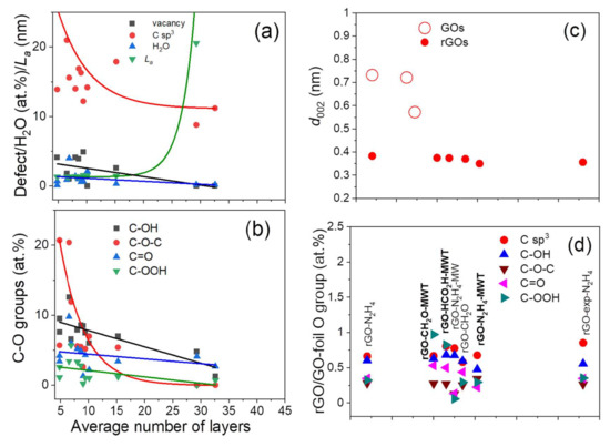 The number of flake layers increases with decreasing content of vacancy, C sp3 defects, oxygen groups and adsorbed water leading to increasing La (Figure 6a,b), what is accompanied by decreasing interlayer distance (Table 1, Figure 8c). In GOs, the water between the interstitial graphene layers bonded to a large amount of oxygen groups through hydrogen bonding results in a larger interlayer distance. Reduction removes carbon oxygen groups and water, which may remain as adsorbed at the surface, leading to decreasing interlayer distance. For rGOs with increasing flake layers, the highest decrease rate is observed for C-O-C groups and then C-OH groups, whereas C=O > C-OOH groups decrease at a slower rate (Figure 6b). The MWT treatment using CH2O provides slower decrease of C-OOH groups in GO in comparison to no MWT reductions (Figure 8d). Simultaneously, the MWT treatment at 250 °C increases vacancy defects, decreases C sp3 defects (Figure 8a) and does not modify strongly the diameter of GO (Figure 8e). This would suggest that MWT facilitates formation of C-OH, C=O and C-OOH groups at vacancies and provides more competitive penetration of reducing agent between the interstitial sites than via vacancies. These additional oxygen groups may result from water dissociation and/or removal of oxygen from epoxy group due to using MWT conditions. The smaller number of flake layers is shown for rGOs, where reduction of GOs oxygen groups (Figure 8e) between the interstitial sites is faster than those in the flake planes. These processes depend on the reducing conditions, i.e., reducing agent and its ability to interact with oxygen and hydrogen atoms in oxygen groups and water, reducing agent kinetics, dynamic interaction of MW with the material treated and the obtained temperature due to MW treatment, which depend on absorption properties of the treated material since the thermal decomposition of oxygen groups is temperature dependent [56,57].