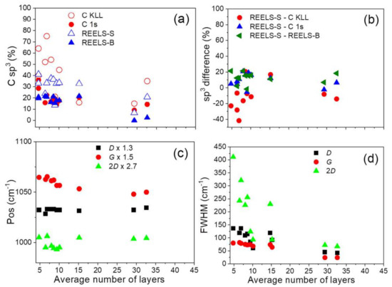 (a) C sp3 content determined from C KLL AES spectra and parameter D (Table 4), C 1s spectra fitting (Table S2) and REELS-surface (REELS-S) and REELS-bulk (REELS-bulk) components (Table 3), (b) the respective differences, Raman spectra D, G, 2D modes (c) positions (Table 2) and (d) FWHMs (Table 2) dependent on the average number of layers in the investigated samples.