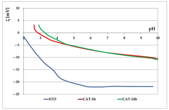 From the results in Figure 2 and Table 2 it can be seen that standard cotton fabric is negatively charged due to the presence of hydroxyl and carboxyl groups (ζ = −21.8 mV), as well as carboxyl groups reveled in scouring and bleaching processes [15]. Cationization during the mercerization process leads to a significant modification of fiber surface. Besides –OH and –COOH groups, –NH2 groups are also present in cationized fabrics (CAT). Therefore, a higher zeta potential (ζCAT-5 = −9.8 mV, ζCAT-24 = −9.9 mV) was measured, confirming that CHPTAC binds strongly to the surface sites. Comparing the cationization effects after 5 and 24 h, it can be seen that the curves are very similar for both time periods. The only difference can be seen in the acidic medium. However, cotton dyeing occurs in a neutral to alkaline medium where the curves are almost identical. It can be concluded that cationization with CHPTAC does not require a reaction time of 24 h, as suggested in [23], and that it is possible to shorten the process to 5 h.