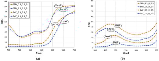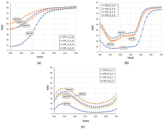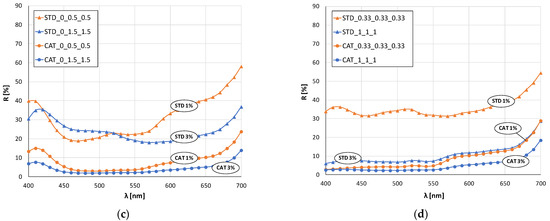 The remission curves for fabrics dyed with a mixture of all three dyes (Figure 4d) show a characteristic color with low intensity and chromatic–achromatic character, except for the standard fabric dyed with a 1% owf dye.
