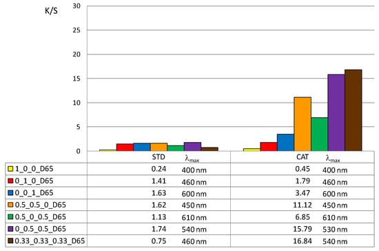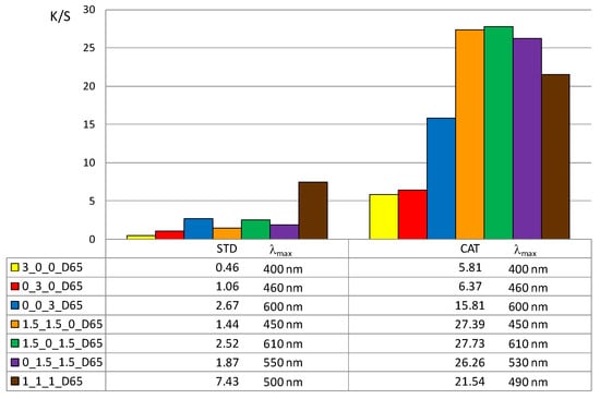In addition, the color depth coefficient K/S was calculated, shown in Figure 5 (for 1% owf) and Figure 6 (for 3% owf), together with the corresponding wavelength of maximum absorption.