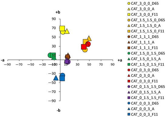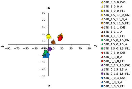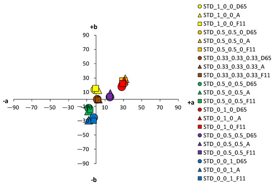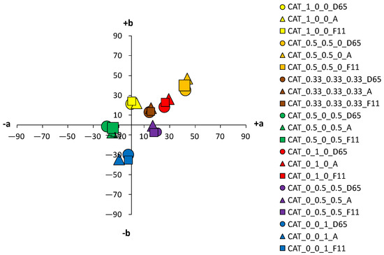 An analysis of the coloristic properties of dyed fabrics was also performed. Figure 7, Figure 8, Figure 9 and Figure 10 show the coordinate values of the standard and cationized fabrics, dyed with 1% and 3% owf dye under three different standard light sources: D65, A and F11. By positioning the colors of the samples in the a*/b* color space, the influence of cationization is clearly visible. Higher chroma was obtained for cationized fabric for both concentrations (1 and 3% owf), which is confirmed by the shift of the color from the center of the diagram.