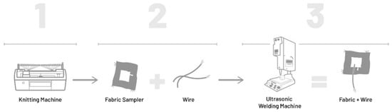 During the assembly process, conductive knitted fabric was joined with a copper litz wire. In order to make the proper contact point between the silver yarns and the copper conductor, the conductor was stripped manually to about 10 mm and then inserted between the active textile and a waterproof tape to provide proper encapsulation. The samples were integrated using an ultrasonic welding machine (Emerson Electric Co.—Branson 2000; Saint Louis, MO, USA), as shown in Figure 2. The method involved a longer optimization process with an experimental design. During this process, there were several parameters involved that ensured the optimization of each joint between the two materials. In order to optimize the welding parameters for a bond, some visual characteristics were taken into consideration. As the method applies to to wearable technologies and its base materials are flexible textiles, one of the main factors involved in its visual characteristics is the avoidance of damage to the conductive fabric during the bonding process and of the possibility of burning and tearing due to overheating and thermal energy discharge from the horn during bonding.