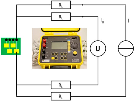 In order to generate a measurable voltage, high currents of up to 10 A were required. The current was provided by two of the four contacts. The falling voltage at the resistor was measured by a voltmeter over the two remaining conductors. Based on Ohm’s law, it was possible to calculate the resistance of the contact. The contact resistances were in the range of only a few milliohms [24].