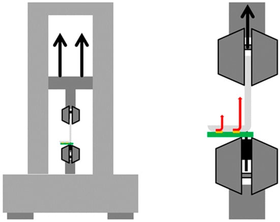 The textiles were clamped on a table, which was fixed on the bottom section of the Zwick tensile testing machine (Z020, measuring head: 50 N). The conductors were peeled off the textile at a 90° angle. The force was applied perpendicularly to the textile (Figure 5). A load cell with a maximum force of 50 N was used at a travel speed of 100 mm/min [26,27,28].
