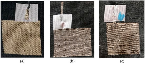 Figure 6 shows pictures of the different samples: unwashed, 15× washed and 30× washed. The samples featured the same kitting parameters and the same tail structure, but the size of the textile electrodes differed. The size of the conductive electrode did not influence the connection process of the wire and the tail. The pictures showed structural alterations in the knitted fabric. The white waterproofed tape secured the connection and supported the connection area.