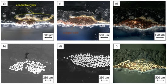 Figure 7 demonstrates microsections of the unwashed, 15 times washed and 30 times washed samples. The microsections were examined under an incident light microscope (KEYENCE—VHX-2000 Digitale Mikroskop, Osaka, Japan, upper row: a, c, e) and a scanning electron microscope (SEM: Hitachi—Tabletop Microscope TM-100, Chiyoda, Japan bottom row: b, d, f). The pictures illustrate the connection between the textile conductive yarns from the tail structure of the electrode and the metallic wire. Pictures (a) and (d) in particular show several contact points, which is a good sign for a low-resistance joint.