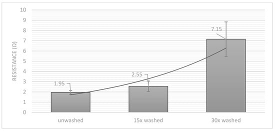 In order to investigate the electrical properties and the quality of the connection, a four-wire resistance test was performed. As expected, the electrical resistance increased with the number of washing cycles. While the unwashed samples demonstrated a resistance of just 1.95 Ω, after 15 washing cycles the resistance reached 2.55 Ω and after 30 cycles the samples demonstrated a contact resistance of 7.15 Ω. Moreover, the standard deviation of the values rose with the number of washing cycles (Figure 8). The strands were connected by ultrasonic welding to silver-coated conductive yarns. The coating suffered heavily due to the mechanical and chemical stress during the washing process. In the beginning, there was enough coating on the yarn, so the first cycles did not have a high influence on the resistance of the connection. After repetitive wash and dry cycles, the coating was reduced in thickness and the resistance increased. In summary, it can be said that the number of washing cycles must be regulated to ensure the perfect functioning of smart textiles.