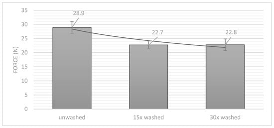 To analyse the mechanical properties of the connection, a peeling test was performed at aa 90° angle. The unwashed samples reached a strength of almost 29 N in the peeling test. After 15 times and 30 times cycles of washing, this value dropped to just under 23 N (Figure 9). When comparing the results with those of soldered joints [26], ultrasonic welding shows comparable values of 23 N. It can also be seen that the strength does not decrease further with the number of washing cycles, which indicates that the designed joints were very durable. The number of washing cycles did not have to be regulated due to the strength of the joints. Evidently, the connection was not influenced by mechanical stress during the washing cycle.