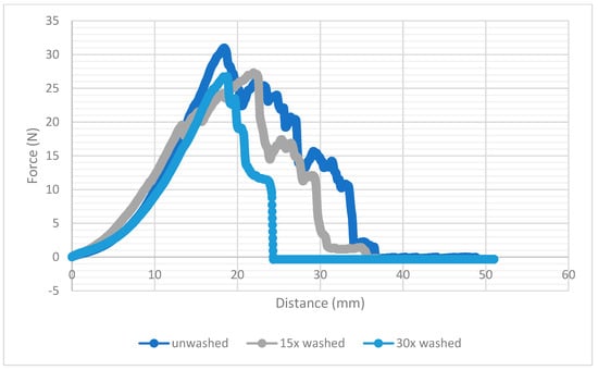 Figure 10 illustrates the course of force during the peeling test for each sample. The graphs show an approximately uniform development. The washed samples demonstrated an irreducibly lower maximum force than the unwashed samples, but the course and the pitch angle were nearly the same. The results show the excellent mechanical properties of the joint. Both the unwashed and the washed samples demonstrated very high peel strengths. It can be concluded that the joints were hardly affected mechanically by the washing process. Figure 10 also shows that the maximum ductility of the joint decreased with the number of washing cycles. The entire structure thus became more brittle.