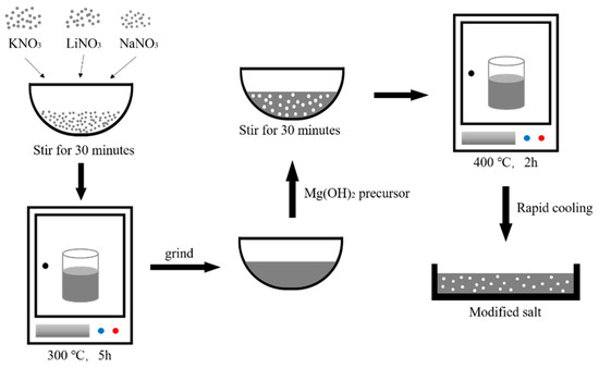 According to the ratio in Table 1, the magnesium hydroxide precursor was added to the ternary eutectic nitrate. Then, we ground it in an agate mortar for 30 min. After that, the mixture was transferred to a ceramic crucible and placed in a resistance furnace at 400 °C for 2 h to ensure complete decomposition of the magnesium hydroxide precursor. After taking it out, it was quickly cooled in air and ground to obtain a sample. The process is shown in Figure 1.
