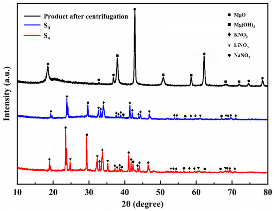 Figure 2 shows the XRD spectra of samples S0, S4, and the product after centrifugation. There are characteristic peaks at 19.03°, 23.52°, 33.06°, 33.84°, 41.15°, and 46.61° in sample S0, corresponding to the (110), (111), (200), (112), (221), and (113) crystal planes of KNO3. Two peaks at 29.41° and 38.99° represent the (104) and (113) crystal planes of NaNO3, respectively. In addition, the crystal plane (104) of LiNO3 could be found according to the characteristic peak at 32.21°. It can be seen that the ternary nitrate was successfully prepared. After centrifugation, characteristic peaks can be seen at 36.89°, 42.86°, 62.22°, 74.58°, and 78.51°, corresponding to (111), (200), (220), (311), and (222) crystal planes of MgO. Sample S4 possesses several characteristic peaks of MgO at 42.96° and 62.22°. It can be seen that MgO is formed in situ in the ternary nitrate system. The characteristic peaks at 18.59°, 32.84°, 38.02°, 50.85°, 58.64°, 68.87°, and 72.03° mark to (001), (100), (101), (102), (110), (200), and (201) of Mg(OH)2 planes. However, no characteristic peaks of Mg(OH)2 were found in samples S0 and S4, indicating that the magnesium hydroxide precursor was completely decomposed when the nanoparticles were generated in situ. The reason why the characteristic peaks of Mg(OH)2 can be seen in the product after centrifugation might be because MgO combines with water during the centrifugation process to form a trace amount of Mg(OH)2.