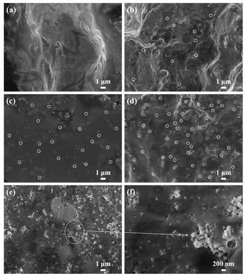 SEM micrographs of (a) sample S0, (b) sample S2, (c) sample S4, (d) sample S6, and (e,f) sample S7.