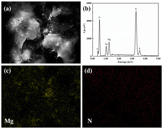 The element distribution of the sample was determined by the area scanning method of the energy spectrum. Figure 5 is the element distribution of modified nitrate. Figure 5c is the distribution of the Mg element. Figure 5d shows the distribution of the N element, which represents the distribution of nitrate. It can be seen from the element distribution diagram that MgO nanoparticles are evenly dispersed among the ternary nitrates.