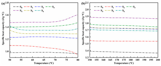 Figure 6a,b are the specific heat capacity curves at 50–80 °C (solid phase) and 150–200 °C (liquid phase), respectively. The overall sensible heat capacity can be judged by selecting the specific heat capacities at 60 °C (solid phase) and 170 °C (liquid phase). Table 2 shows the specific heat capacities of ternary nitrate and modified salt in the solid phase and liquid phase. For the same sample, the specific heat in the liquid state is improved compared with that in the solid state. The reason for this phenomenon is that in the molten state, the ions in the molten salt perform randomly free movement, which can carry more energy. The specific heat in the solid state increases first and then decreases with the growth of nanoparticles. When the content of nanoparticles is 2%, the solid specific heat is the largest, which is 1.479 J/(g·°C). Compared with LiNO3–NaNO3–KNO3 ternary nitrate, it has increased by 51.54%. With the increase of nanoparticles, the specific heat in the liquid state shows an increasing trend at the first stage and then a decreasing tendency at the following stage. When the content of nanoparticles is 2%, the specific heat of the material at the liquid state reaches the peak, which is 1.878 J/(g·°C): an increase by 44.50%.
